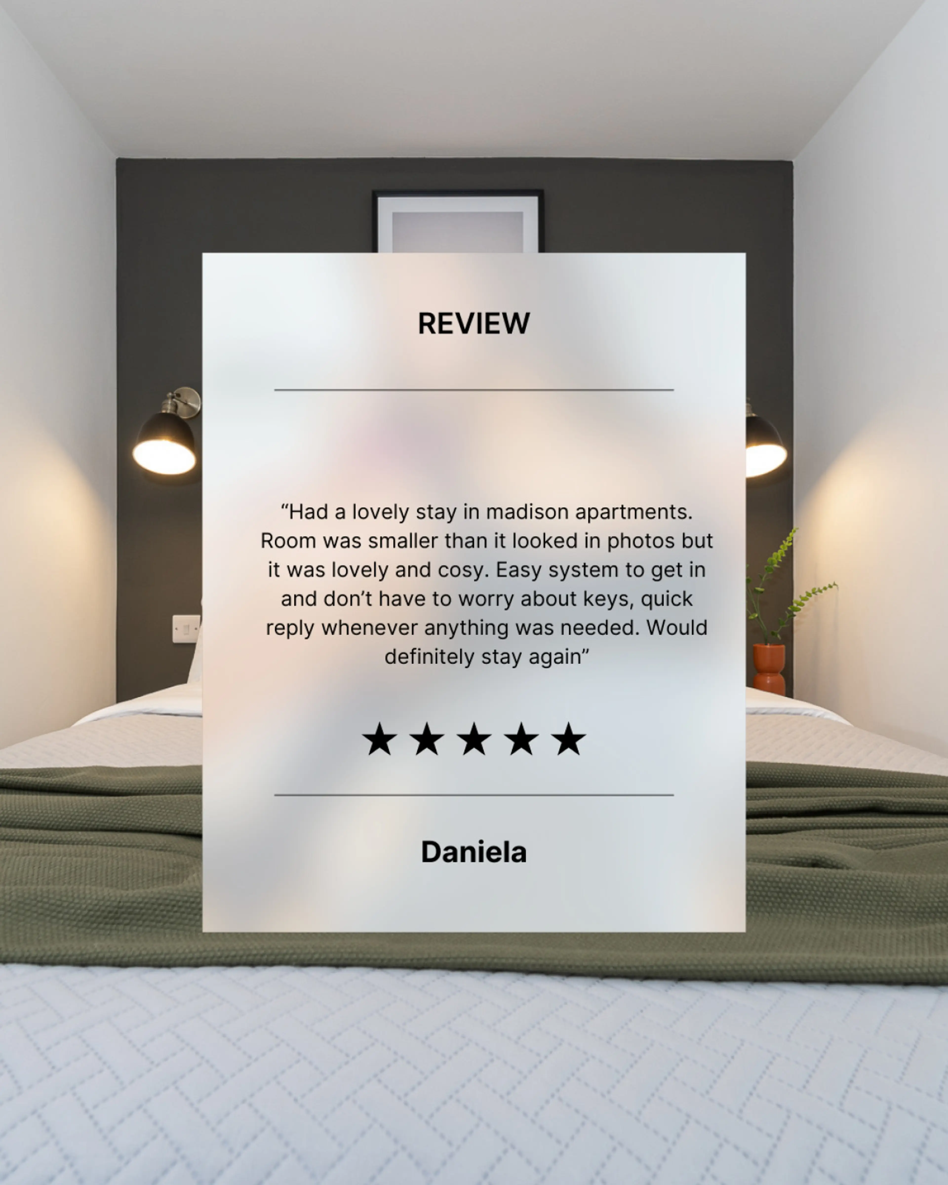 Negative: The fire alarm goes off on a weekly occurrence (sometimes twice a week if you’re lucky), takes nearly an hour on average for someone to come and turn off the alarm (set off by anything), no number to phone and speak to someone in charge of the property which is distressing when stood outside with the fire alarm going off and having to have a WhatsApp message conversation when the fire brigade are turning up…. Nor any assurance as to when someone is going to turn off the alarm. Which in itself is a good alarm, incredibly loud would just be nice if it went off when there’s a fire. Customer service believes this is acceptable as it’s a safety measure saving us from burnt toast and long showers.