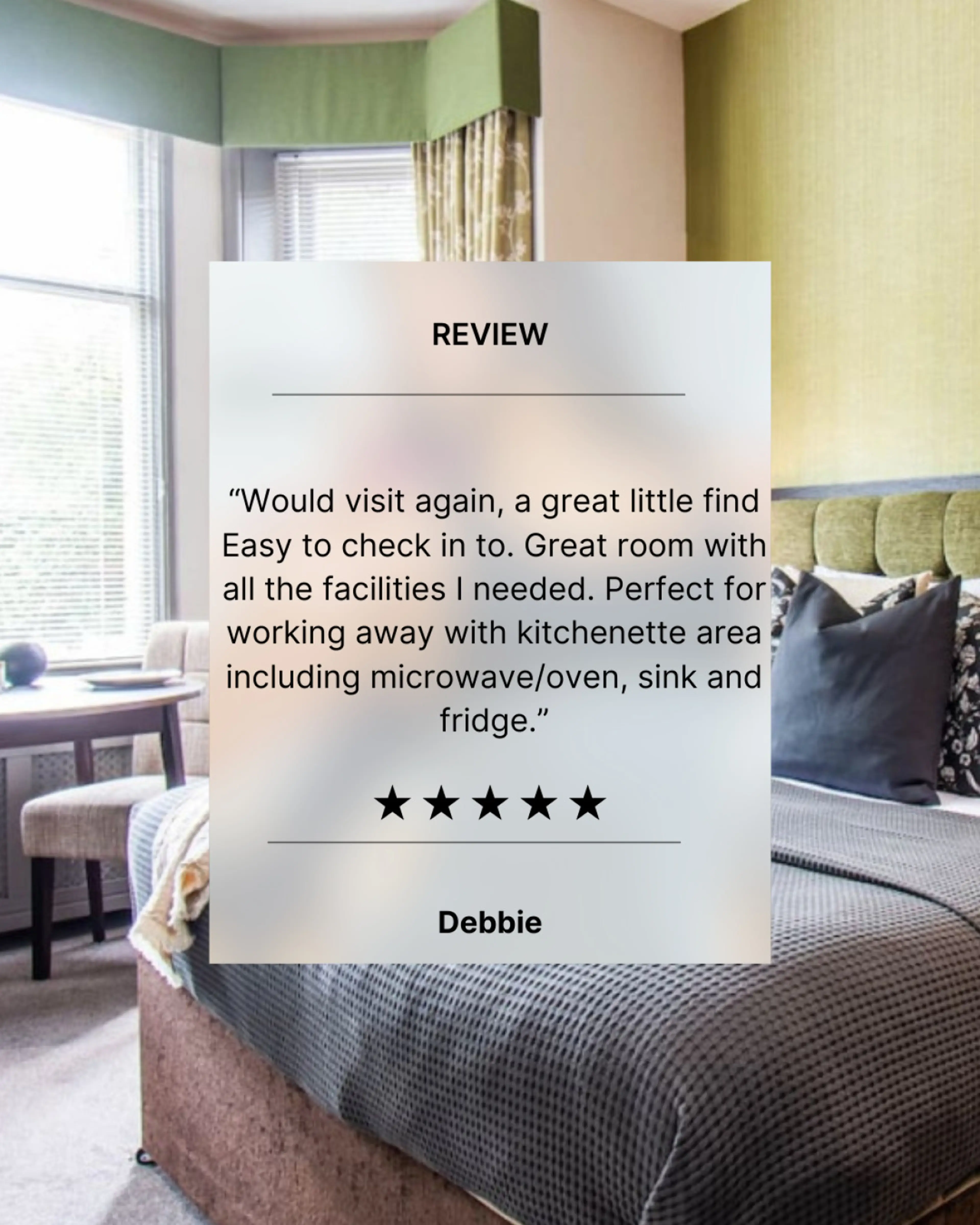 Positive: Easy to check in to. Great room with all the facilities I needed. Perfect for working away with kitchenette area including microwave/oven, sink and fridge.